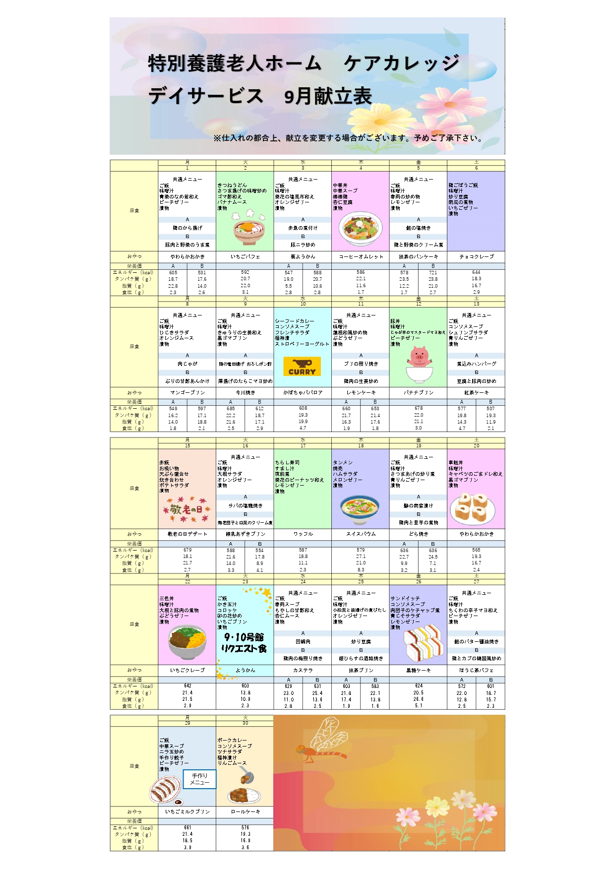 9月の献立をご紹介いたします。