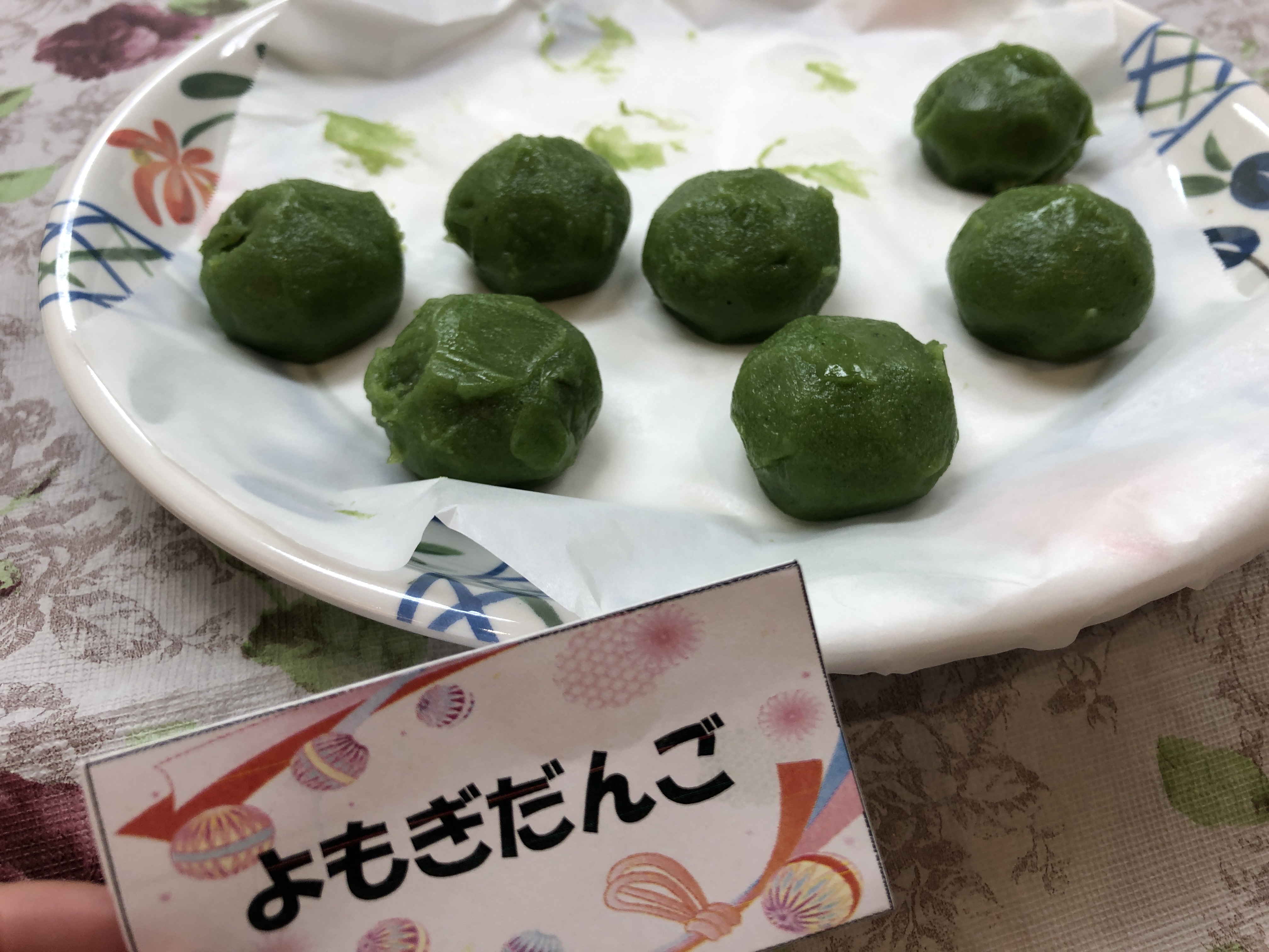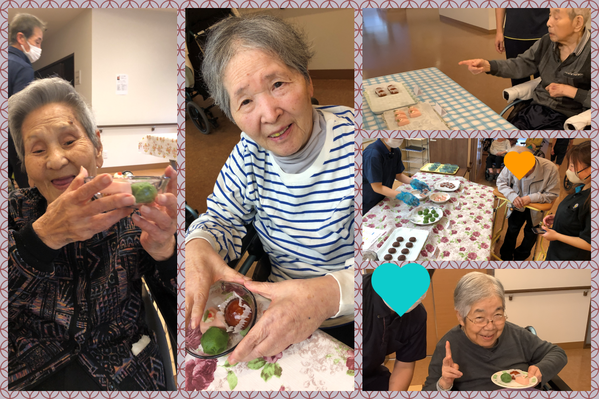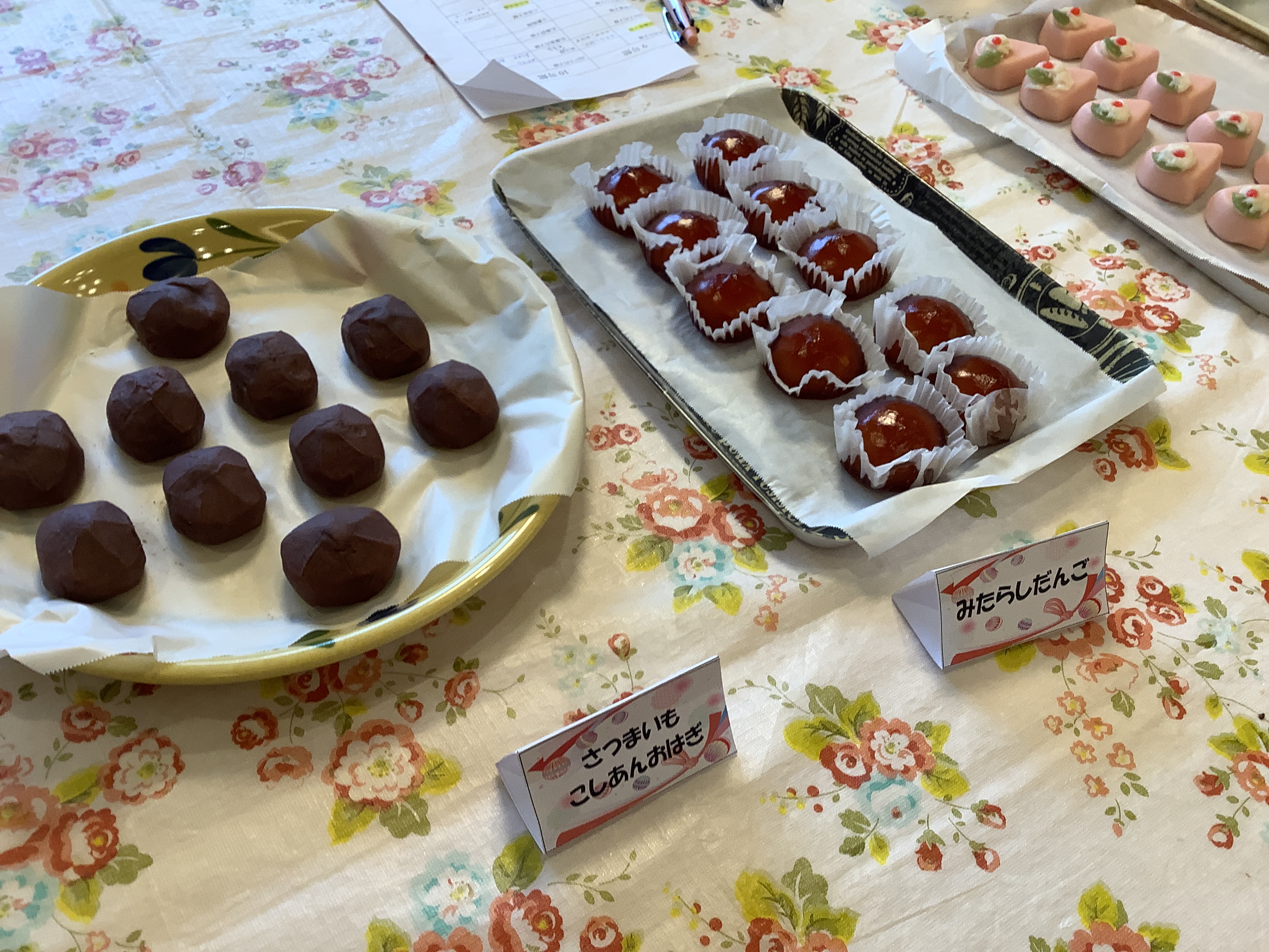和菓子の販売レクでは「みたらしまんじゅう」「よもぎだんご」「さつまいものこしあんおはぎ」「ねりきり」の4種類の和菓子が用意され、お好きなものを選んでいただきました😊