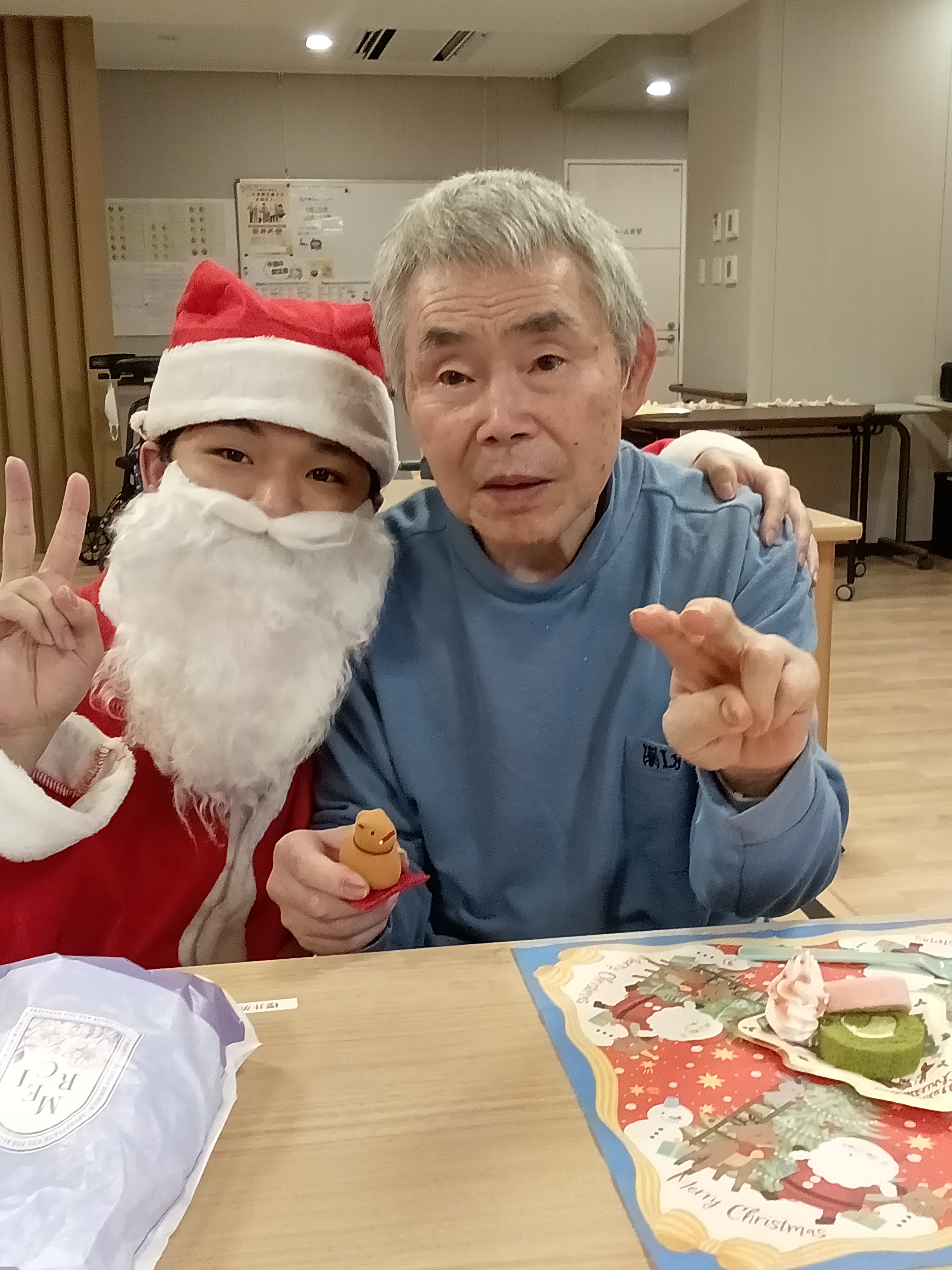 カラフルなロールケーキ、好みのジュースを召し上がっていただきました。サンタさんからのプレゼントにも喜ばれておりました。